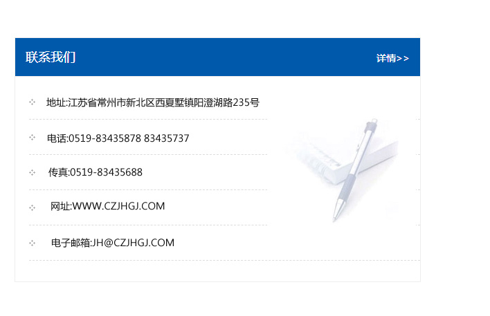 傳真:0519-83435688    郵編:213135    網址:WWW.czjhgj_com.nbdfsd.com    電子郵箱:JH@czjhgj_com.nbdfsd.com